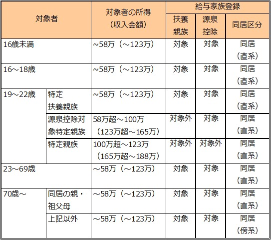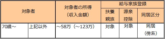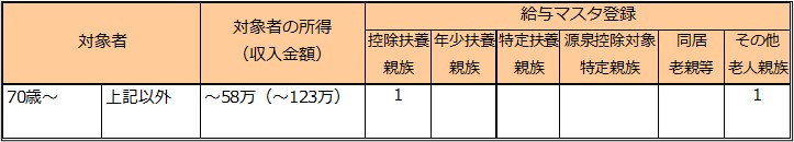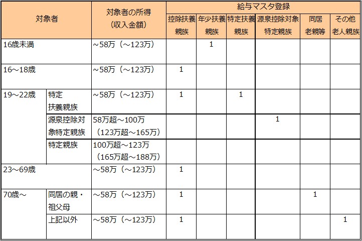 〔給与家族登録〕から設定する場合は<表1>を参考にしてください。