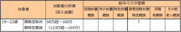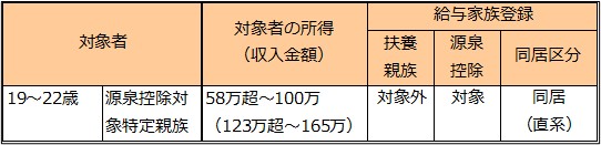 2025年度より扶養親族の年齢が19~22歳、所得が58万超~100万円の場合、源泉控除対象となる特定親族