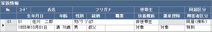 同居している70歳の叔父は同居区分が「同居(傍系)」で、その他老人扶養親族に数えられます。