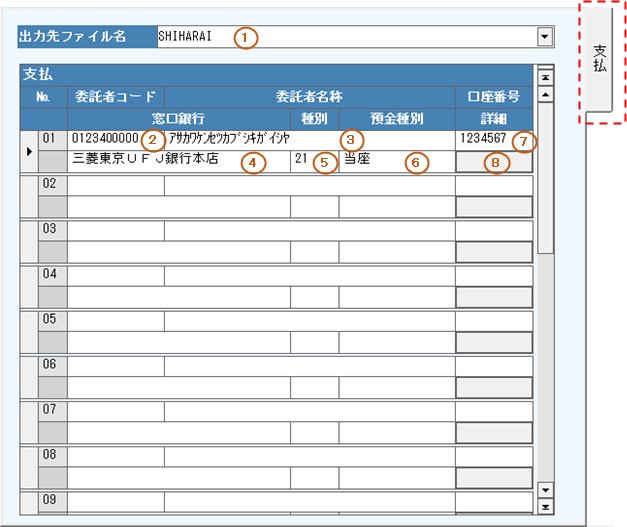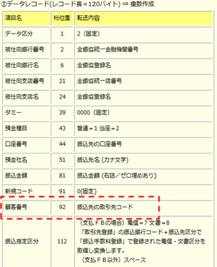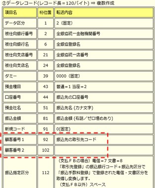 銀行に出力ファイルの(全銀協既定の)フォーマットを確認し、顧客番号が2つある場合、顧客番号の桁数の