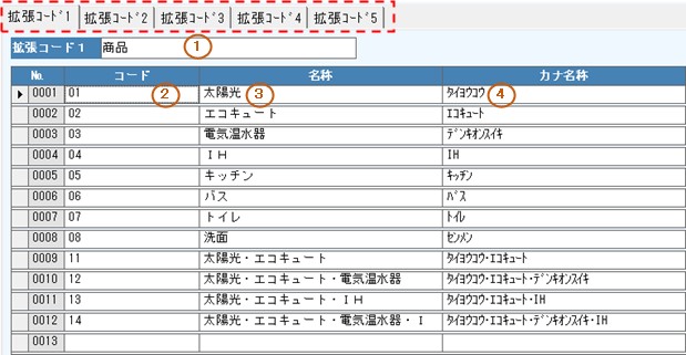 「基本拡張項目情報タブ」の「拡張コード1」~「拡張コード5」及び