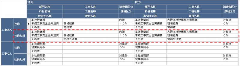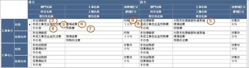 する仕訳の設定を入力します。借方と貸方の工事名称は、入力できません。