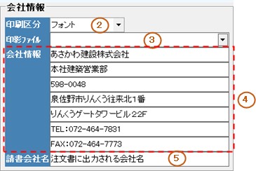 印刷区分が「フォント」の場合、ここで入力した内容が会社情報として出力されます。