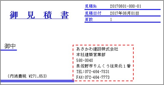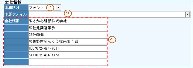 印刷区分が「フォント」の場合、ここで入力した内容が会社情報として出力されます。
