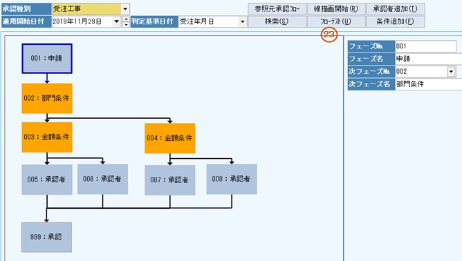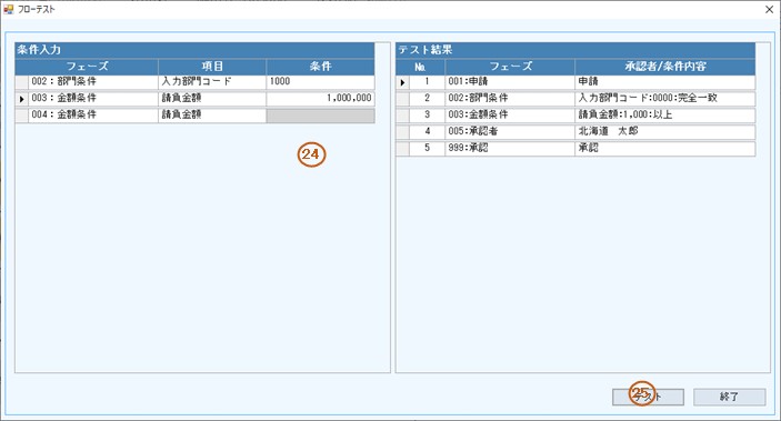 23.画面に表示中の適用開始日付、承認種別のフローでフローテストを実施します。