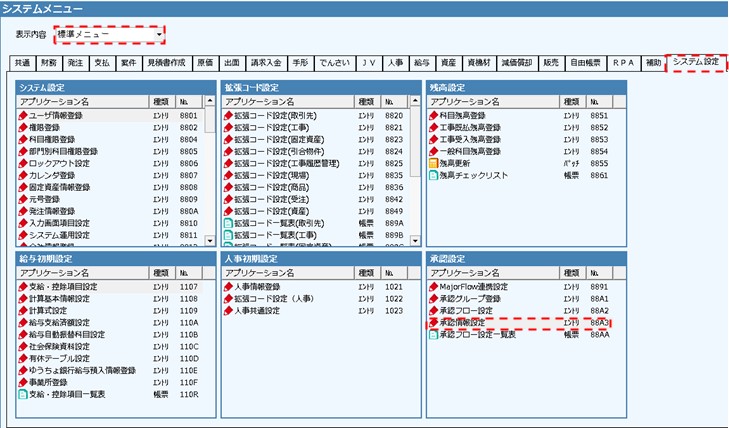 システムメニュー「標準メニュー」から〔システム設定〕の承認設定グループボックスの
