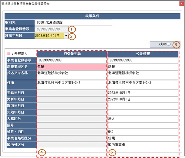 〔取引先登録〕の情報と適格請求書発行事業者公表サイトの情報に差異がある場合、背景色が変わります。