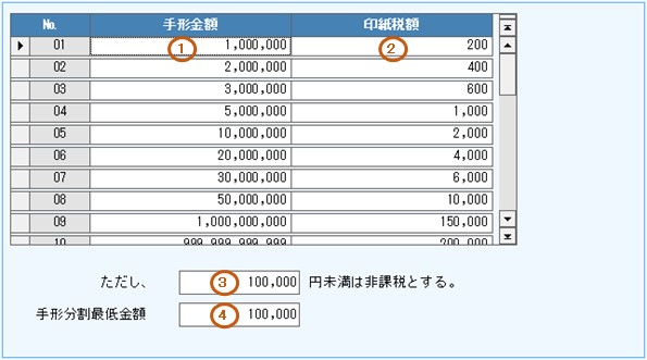 例)手形金額 1,000,000 印紙税額 200 の場合、手形金額1,000,000円までが200円の印紙税。