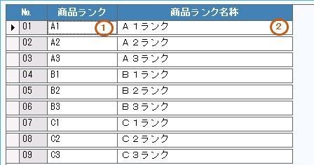 1.商品ランクのコードを入力します。必須項目です。 〔受注入力〕〔売上入力〕で利用できます。