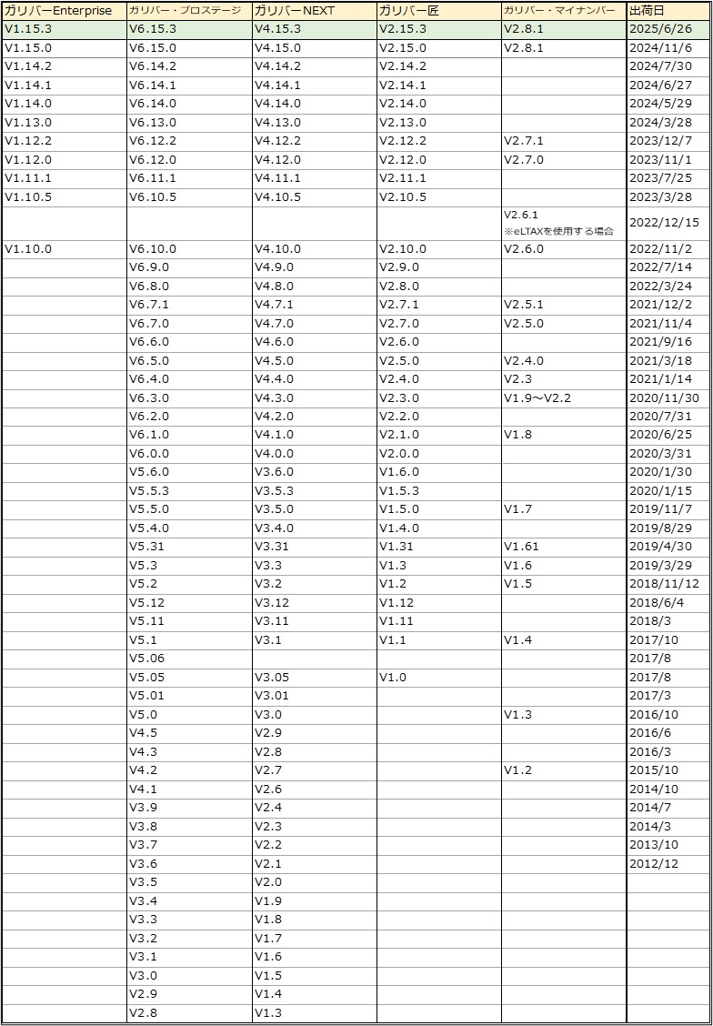 『ガリバー』シリーズ(ガリバーEnterprise、ガリバー・プロステージ、ガリバーNEXT、ガリバー匠、ガリバー・マイナンバー)のバージョン対比表です。