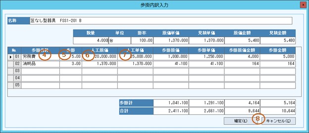 〔見積明細入力〕にて労務費や消耗品等の歩掛情報を入力することが可能です。
