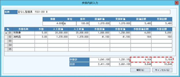 歩掛計の歩掛原価金額、歩掛金額が元画面フッタ部の歩掛計に金額が反映されます。