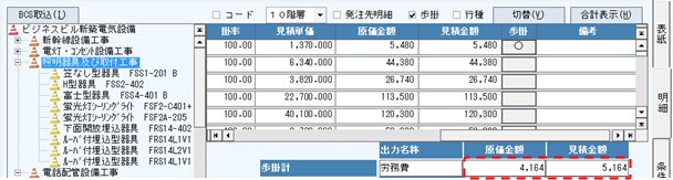 人工原価を入力後に、歩掛、人工原価を元に歩掛原価、歩掛原価金額が自動計算されます。