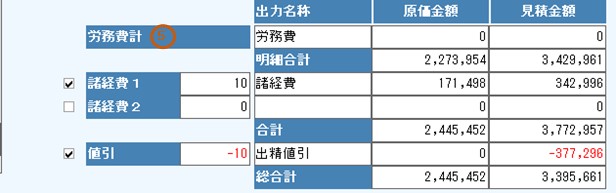 必要に応じて、諸経費1、諸経費2、値引にも労務費計と同様の方法で工種・費目・細目を入力します。