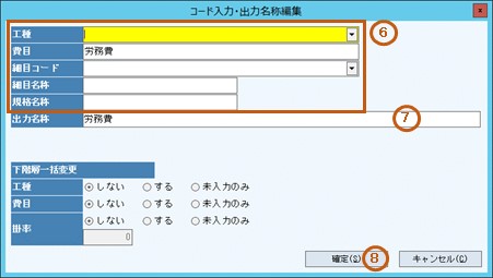 出力名称1、2は、あらかじめ入力済みでも、細目コードを入力後に細目名称、規格名称へ置換されます。