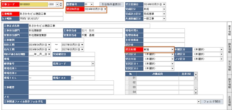 受注年月日、受注形態を入力すると工事コードが自動採番されます。