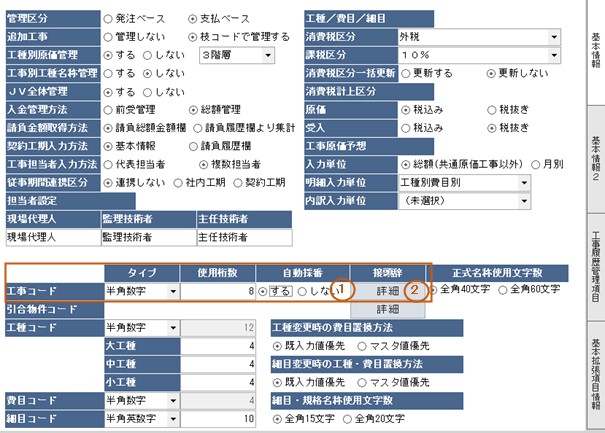 工事コードを自動採番するためには、〔システム設定〕〔原価情報登録〕にて初期設定が必要です。