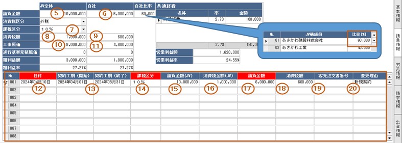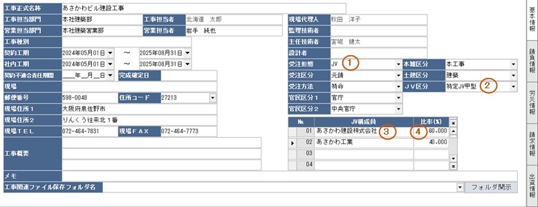 自社がスポンサーになる工事を受注した場合、JV項目も登録します。