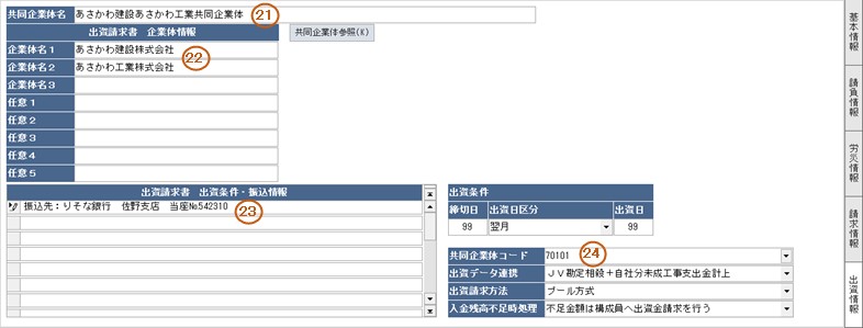 22.出資請求書の企業体情報を入力します。出資請求書に出力します。構成員の会社名称を入力し、出資請求書
