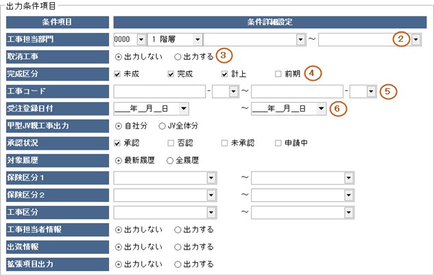 ※工事コードを1件のみ指定して出力する場合は②③④⑥の条件入力は不要です。