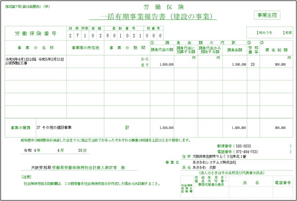 「事業主控」は、一括有期事業報告書の事業主控を出力します。