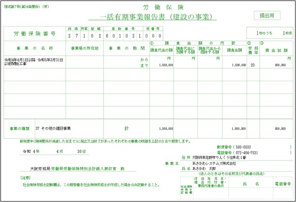 労働基準監督署に提出する〔一括有期事業報告書〕を出力します。
