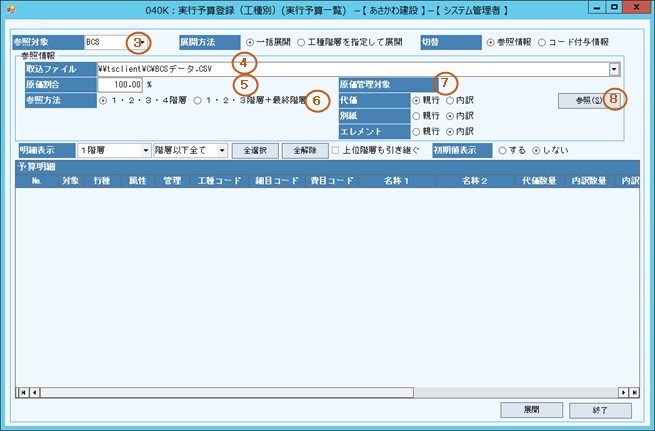 積算システムから出力されたデータ[BCSフォーマット形式(CSV)]を予算情報として取込処理