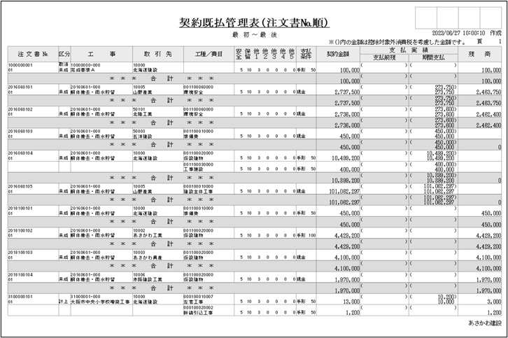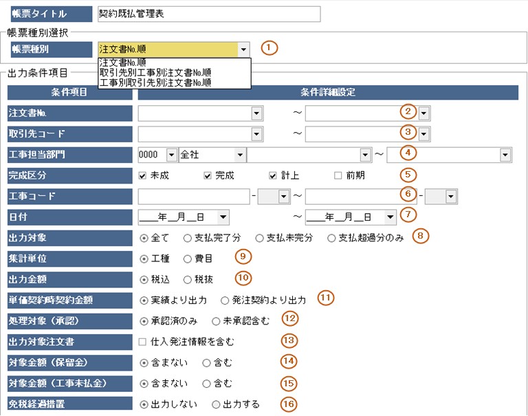 「実績より出力」:該当する注文書№で入力した支払実績を集計して、出力します。