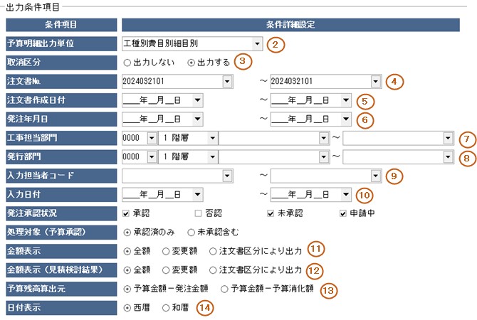 「注文書区分により出力」:出力する発注契約情報の注文書区分によって、「全額」か「変更額」かを