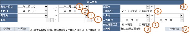 ※伝票№をひとつだけ指定して検索する場合は①②③④の条件入力は不要です。