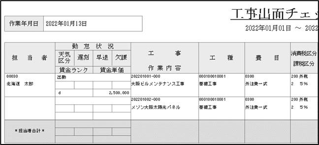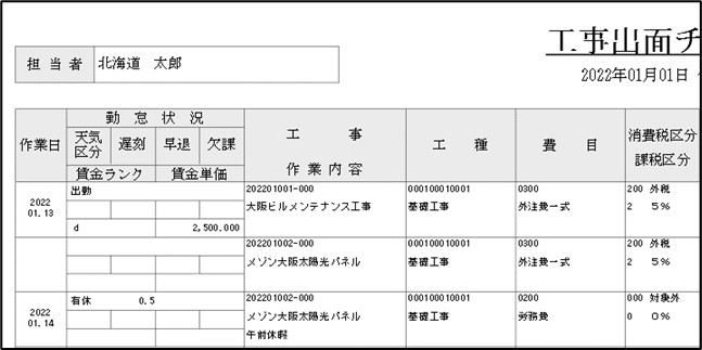 「担当者別作業日順」を選択した場合、担当者毎に改ページを行い、作業日順に明細が出力されます。