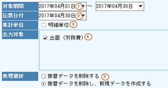 「振替データを削除する」にチェックを付けた場合、対象期間内の出面情報の仕訳が削除されます。