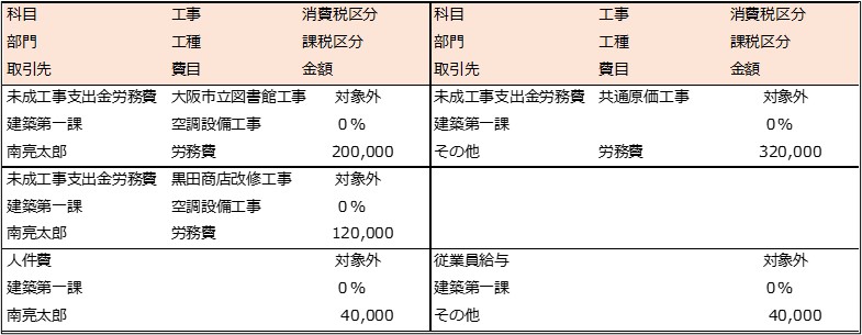 チェックを外した場合、部門別科目別工事別取引先別費目別消費税区分別課税区分別に集計し、
