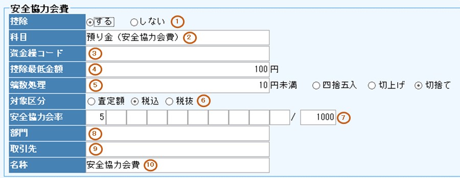 支払1タブを選択し、控除条件の安全協力会費の率を入力します。