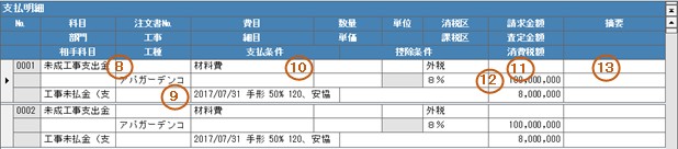 一伝票で複数の契約情報の支払を入力する場合、明細の注文書№に入力します。
