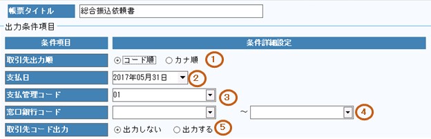 〔総合振込依頼書〕に取引先コードを追加出力する場合は、「出力する」を選択します。