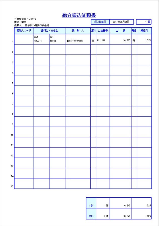 〔支払データ作成〕および〔支払変更〕の処理結果を基に〔総合振込依頼書〕を出力して、振込データの
