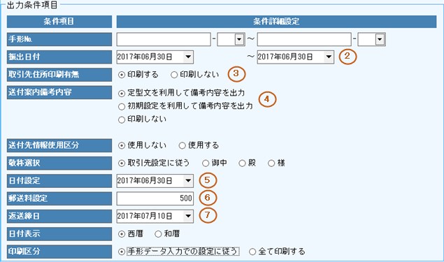 手形送付案内の宛て先欄に、取引先住所を印刷するかどうかを選択します。