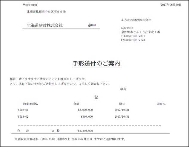 〔システム設定〕〔手形情報登録〕の送付案内備考欄に入力した内容を出力します。