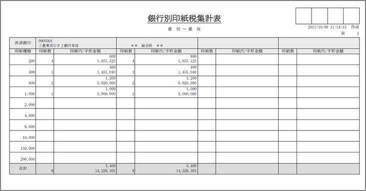 約束手形に貼付する印紙の枚数と金額を確認するには、〔銀行別印紙税集計表〕を印刷します。