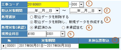 6.対象期間、本体伝票取込の履歴を表示します。