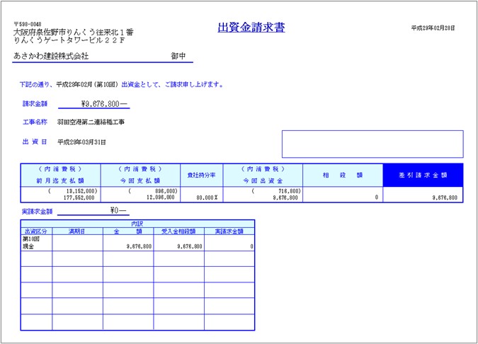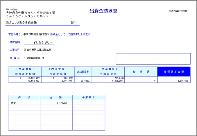 〔JV出資請求データ作成〕で作成した出資請求データを基に、各構成員への〔JV出資金請求書〕を作成します。