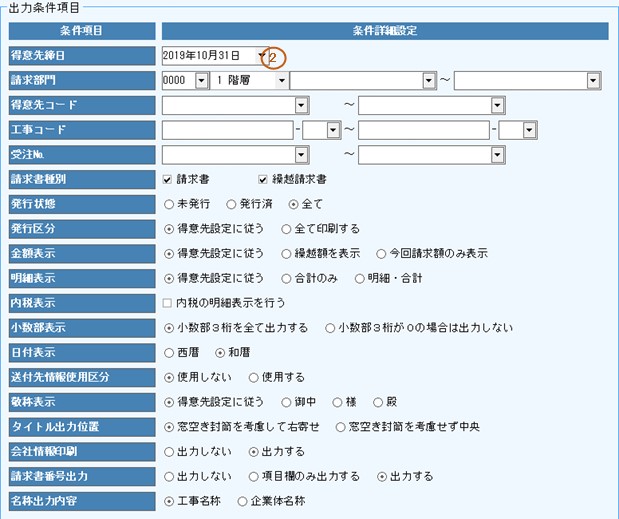 得意先別:繰越請求書を出力する場合、選択します。