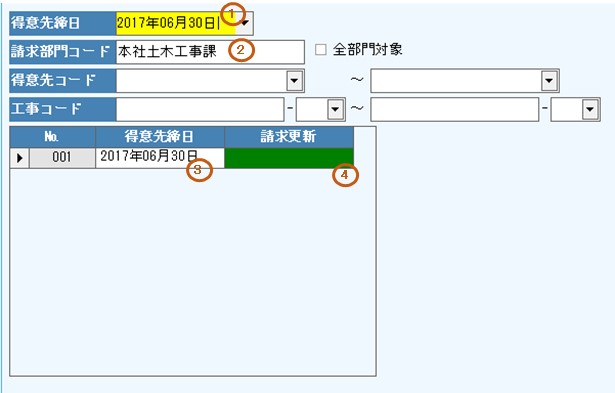 3.〔請求データ更新〕実行済みの得意先締日が表示されます。