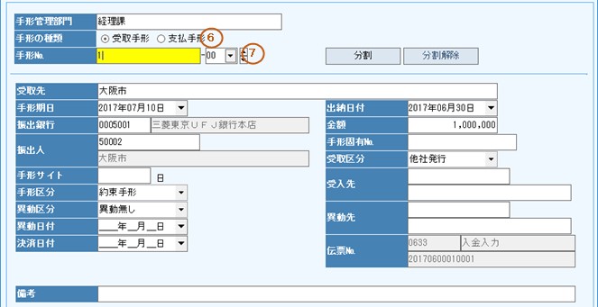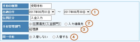 但し、〔入金入力〕の入金部門が未入力の場合、処理条件手形管理部門に入力された部門が手形管理部門