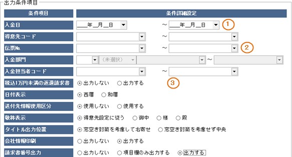※伝票№をひとつだけ指定して出力する場合は①の条件入力は不要です。
