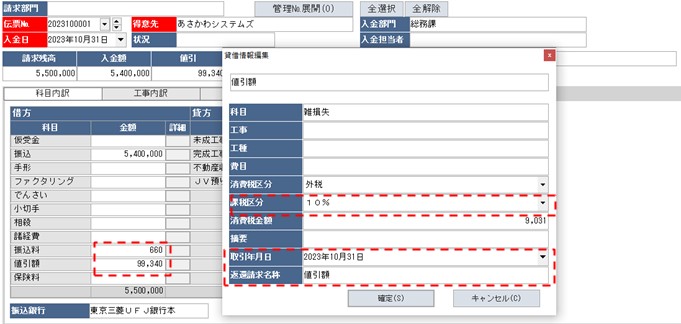 〔入金入力〕における値引き等の控除額の税込の合計額で判断します。
