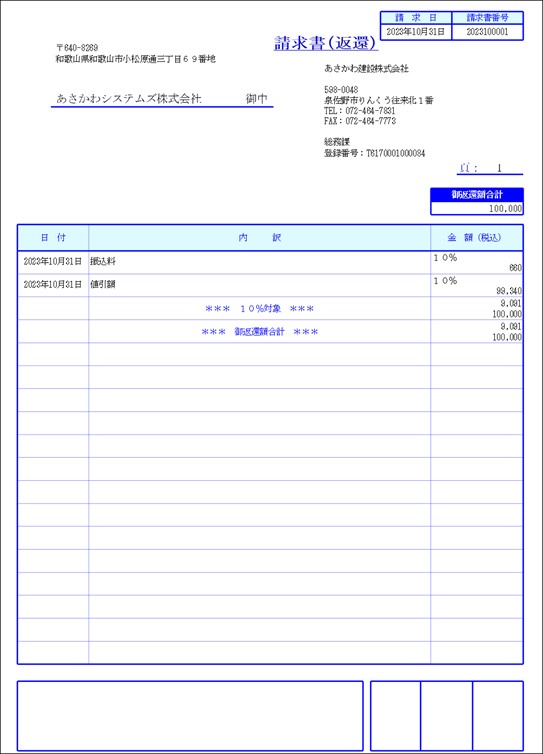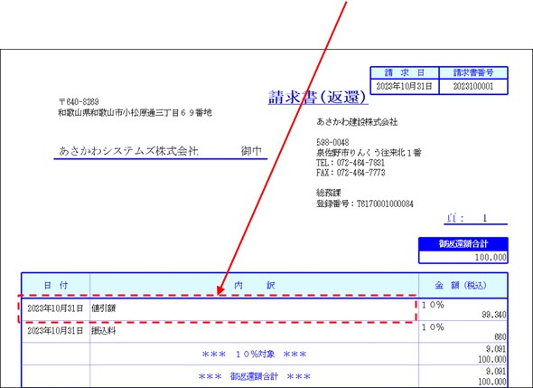 得意先に対する入金時の値引き等に関する返還請求書を発行します。