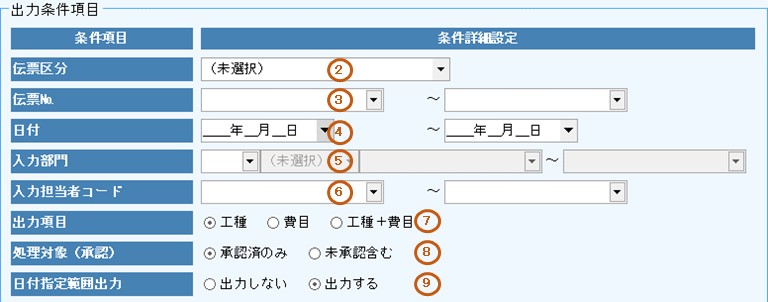 ④で指定した日付範囲を帳票上に出力するかを選択します。