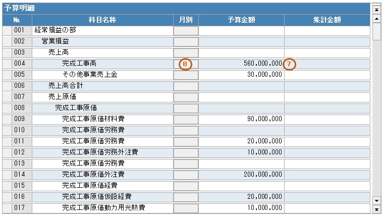 月別部門予算入力画面で入力された予算金額合計が科目別予算金額に反映されます。